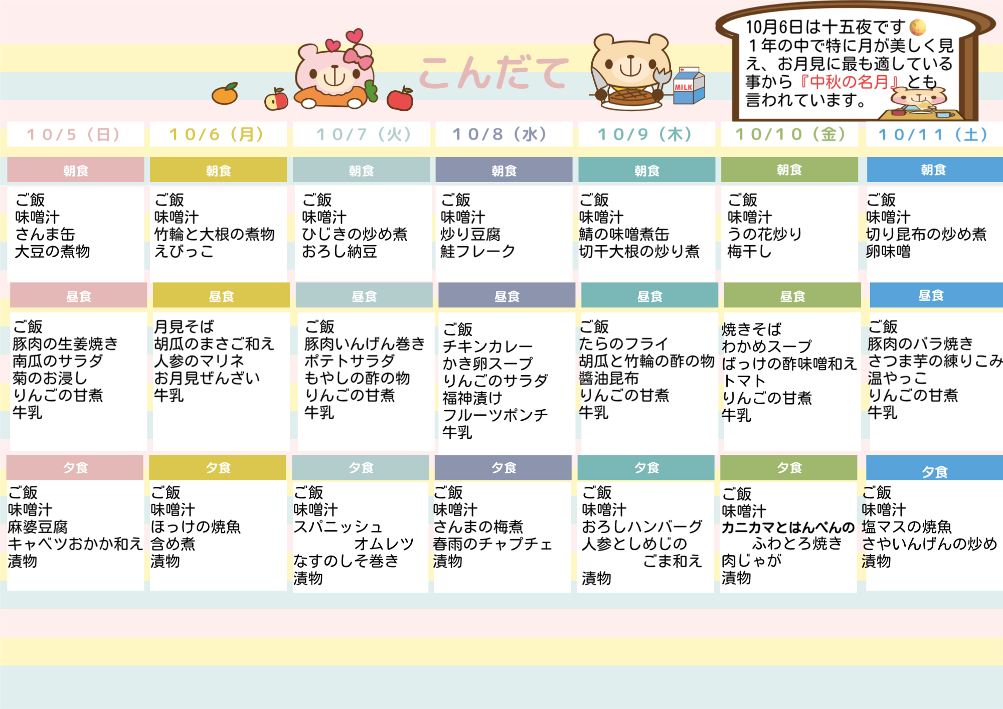 お知らせ TOP > お知らせ > 🍴今週の献立(令和7年10月5日~10月11日)🍴 🍴今週の献立(令和7年10月5日~10月11日)🍴 お問い合わせ TEL 0172-44-7588 入所やご利用について 気軽にお問い合わせください。