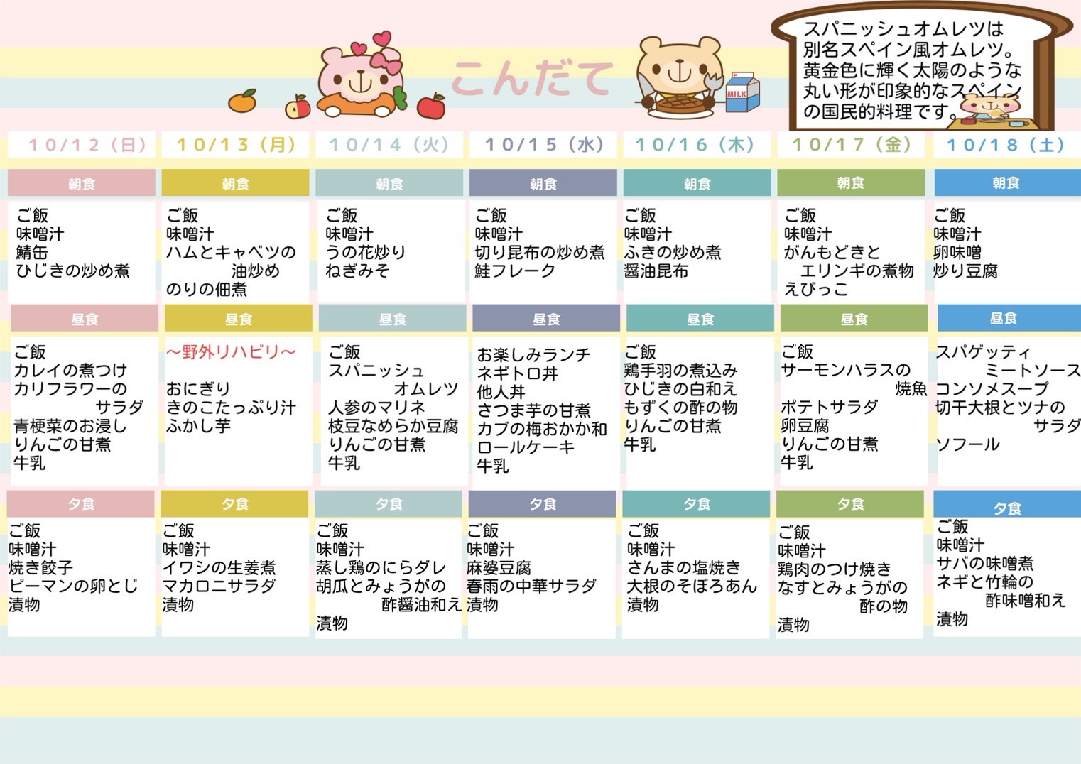 お知らせ TOP > お知らせ > 🍚今週の献立(令和7年10月12日~10月18日)🍚 🍚今週の献立(令和7年10月12日~10月18日)🍚 お問い合わせ TEL 0172-44-7588 入所やご利用について 気軽にお問い合わせください。