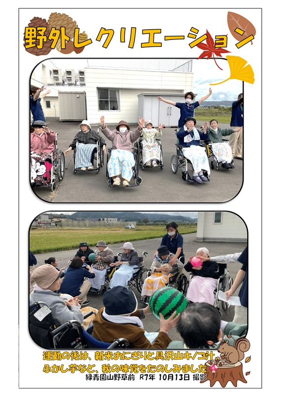 お知らせ TOP > お知らせ > 野外レクリエーション(R7年10月) 野外レクリエーション(R7年10月) 令和7年10月 野外レクリエーションの様子をお届けします。 お問い合わせ TEL 0172-44-7588 入所やご利用について 気軽にお問い合わせください。