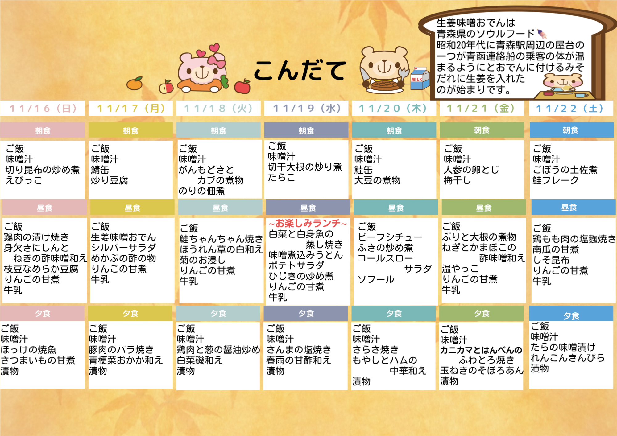 お知らせ TOP > お知らせ > 🍴今週の献立(令和7年11月16日~11月22日)🍴 🍴今週の献立(令和7年11月16日~11月22日)🍴 お問い合わせ TEL 0172-44-7588 入所やご利用について 気軽にお問い合わせください。