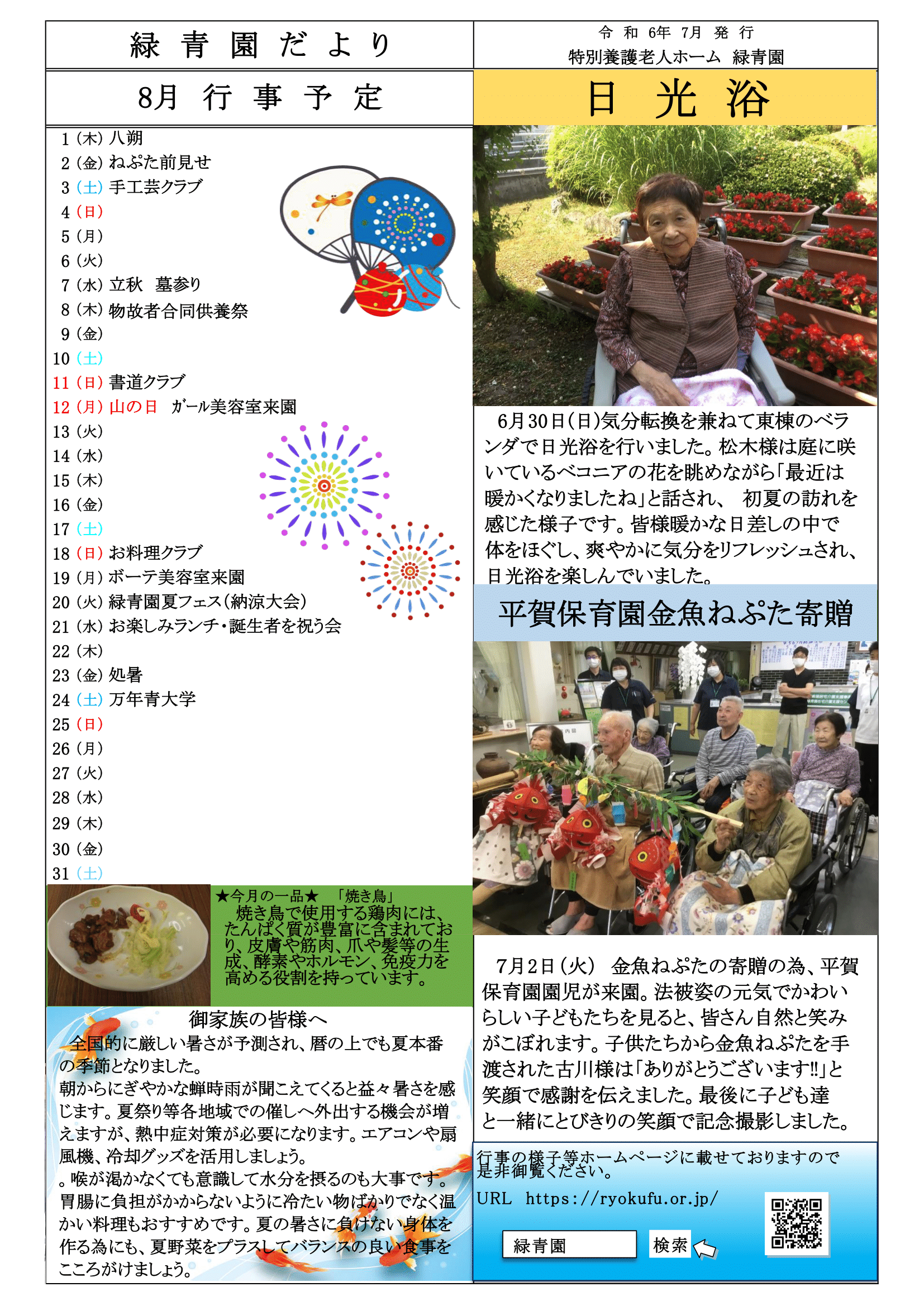 お知らせ TOP > お知らせ > 緑青園だより(R6年8月) 緑青園だより(R6年8月) 令和6年8月の「緑青園だより」をお届けします。 お問い合わせ TEL 0172-44-7588 入所やご利用について 気軽にお問い合わせください。
